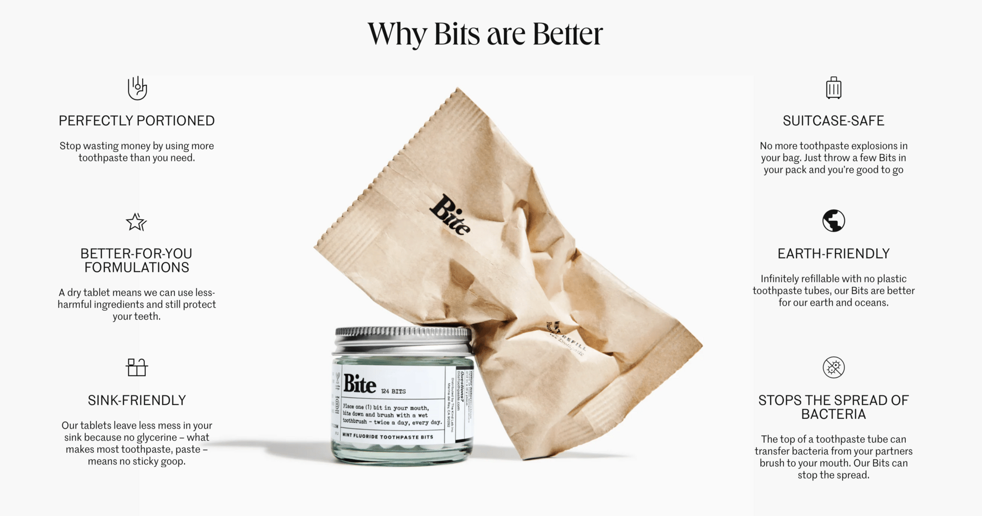 Bite is an oral care brand that replaces traditional toothpaste with chewable toothpaste tablets.